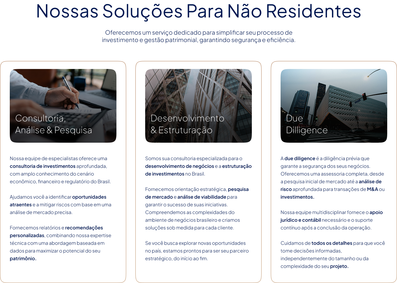O Brasil oferece um mercado de investimentos dinâmico e com diversas oportunidades em setores como agronegócio, tecnologia, infraestrutura e mercado de capitais. Para investidores não residentes, nosso país apresenta um cenário promissor para diversificação e rentabilidade de patrimônio, com grande potencial de crescimento a longo prazo, mesmo diante de um cenário econômico e político complexo. A RCWM é sua ponte para este mercado.